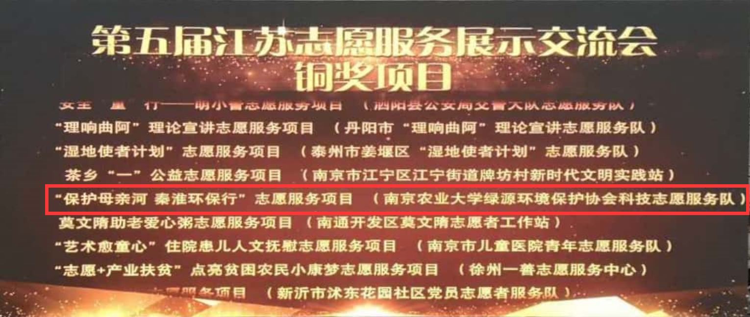 绿源环境保护协会科技志愿服务队开展的“保护母亲河—秦淮环保行”项目荣获铜奖。