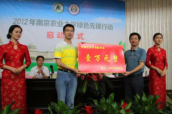 陆鑫达同学将其荣获的“Klaus Toepfer环境奖学金”(由前联合国副秘书长、前联合国环境规划署执行主任克劳斯·托普弗(Klaus Toepfer)教授在中国创立)一万元全额捐献给学校并设立绿色先锋基金,用于支持学生环保工作,表彰先进环保志愿者,李辉信代表吃瓜网
