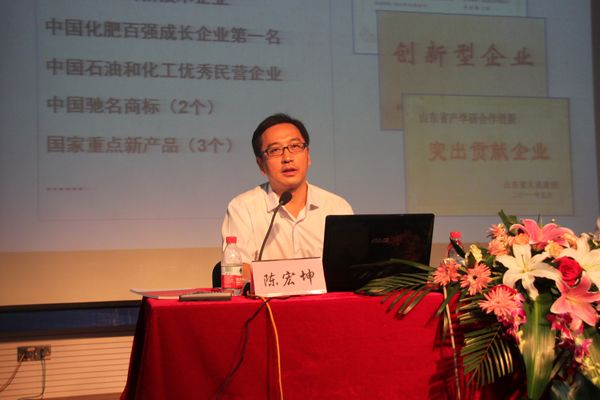 中国化肥百强成长企业第一名、国家重点高新技术企业、上市公司山东金正大生态工程股份有限公司副总裁、国家缓控释肥工程技术研究中心副主任陈宏坤首先介绍了公司的概况,陈总说化肥是粮食的“粮食”,对农业发展和粮食生产的重要作用不言而喻,我国已成为目前世界最大的化肥生产国和消费国,发展新型肥料具有广阔的市场前景。陈总谈到企业的发展目标时用“创新、和谐和国际化”来概括,这正与此次学校“110家知名企业进南农”校庆系列活动的主旨不谋而合。陈总还详细介绍了他们公司2013年的招聘计划,对同学们在心态、素质、能力等方面提出了几点建议,引起同学们的强烈共鸣。