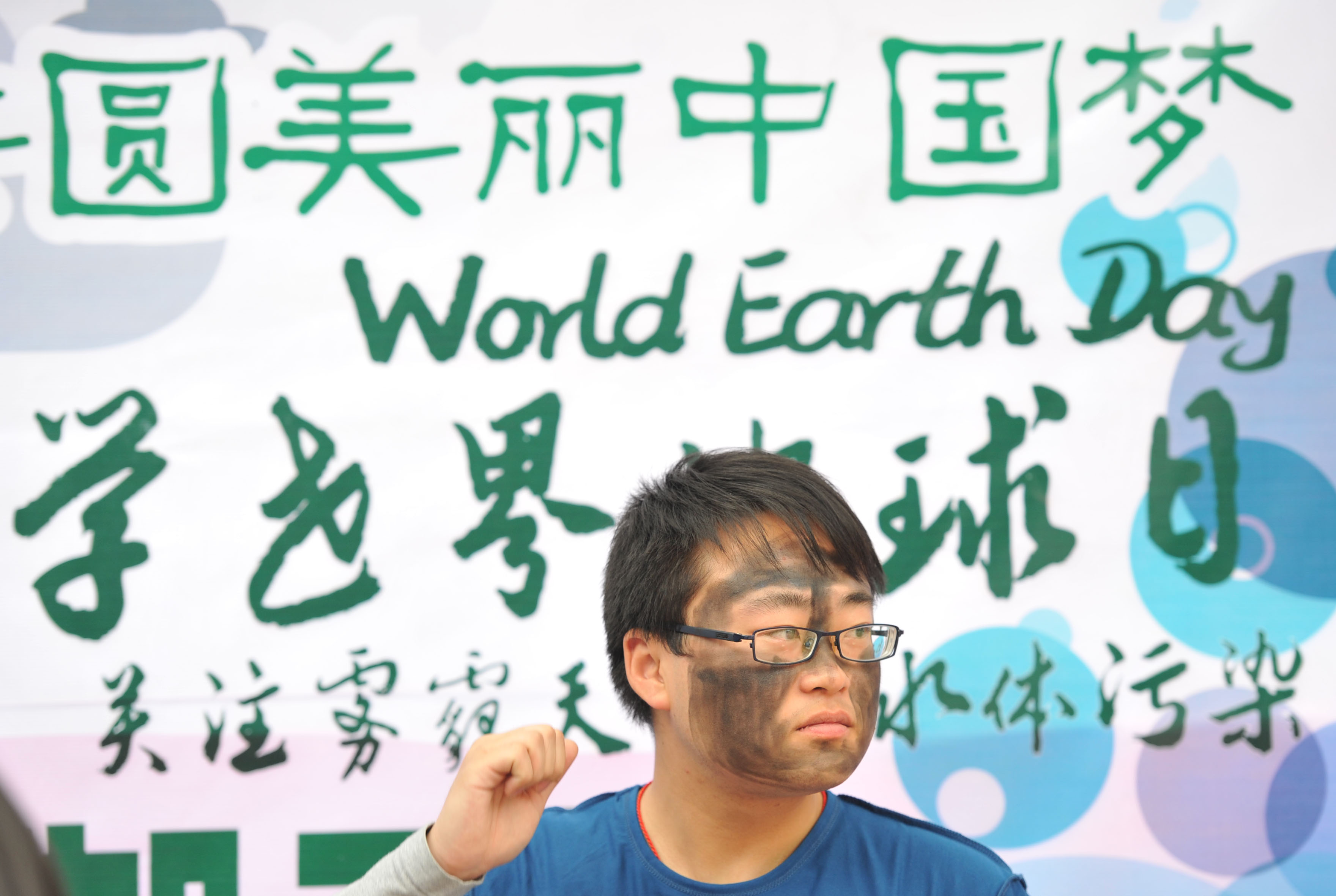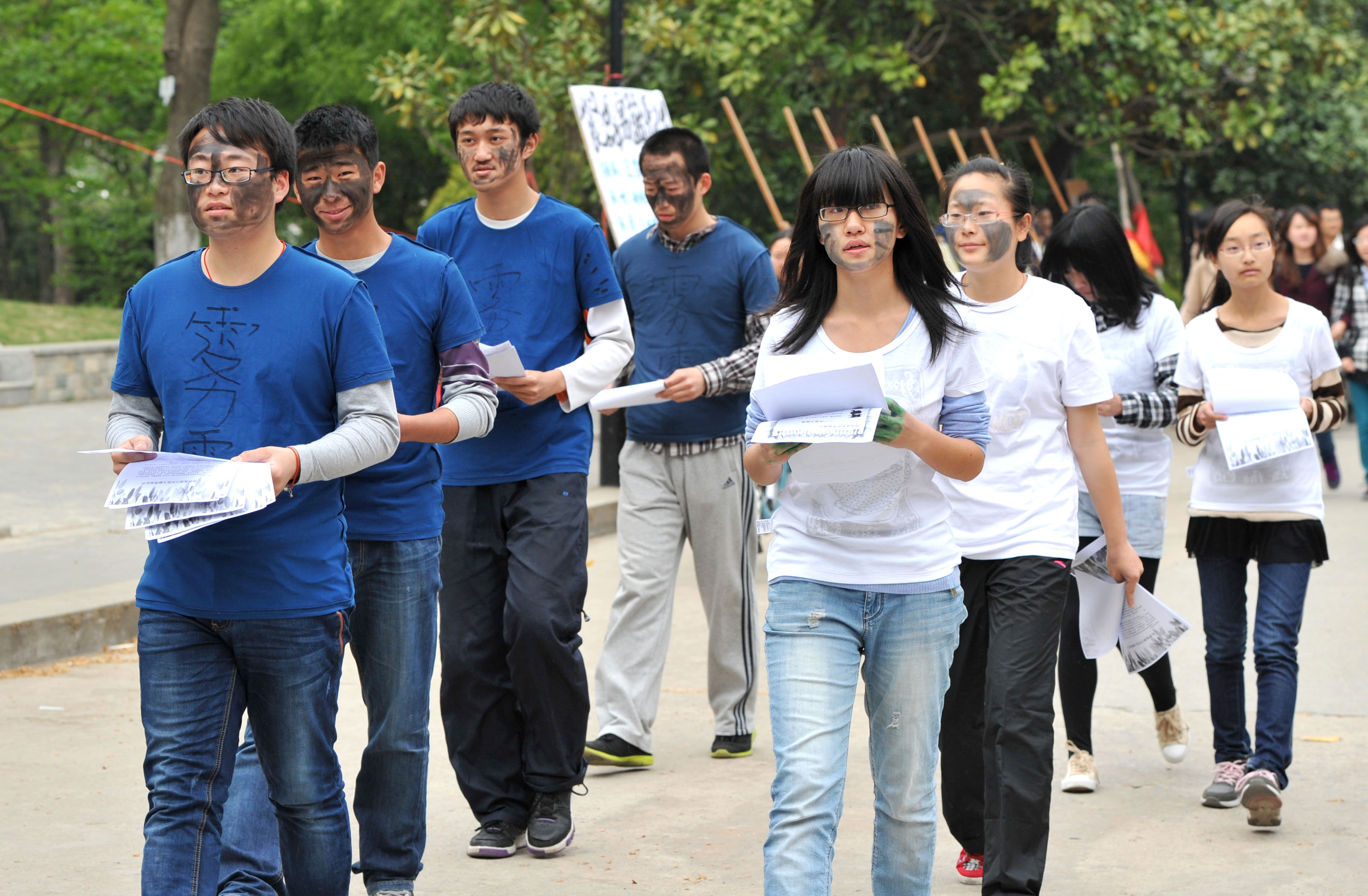 上午十一点,活动正式启动。八名志愿者分别穿着代表天空的蓝色上衣和代表水源的白色上衣,在脸和手臂上彩绘黑色及灰色图案,象征天空充满灰霾、水体已被污染的环境现状。志愿者们行走在教学楼、主楼、图书馆等校园标志性建筑之间,向过往同学发放环保倡议书和宣传单,呼吁大家关注空气污染、水污染等迫在眉睫的环境问题,认识到保护地球、保护环境的重要性。与此同时,吃瓜网