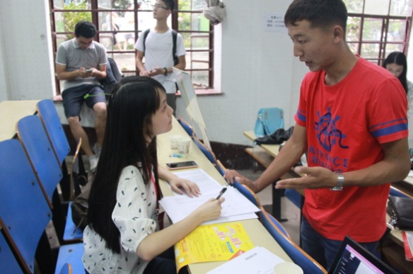 对来自全国各地的新同学的热烈欢迎。之后,新生协同家长会在地图墙前留影合照。新生在101室完成报道后,即可去宿舍楼登记住宿。而志愿者们也将陪同他们完成整个入学过程。