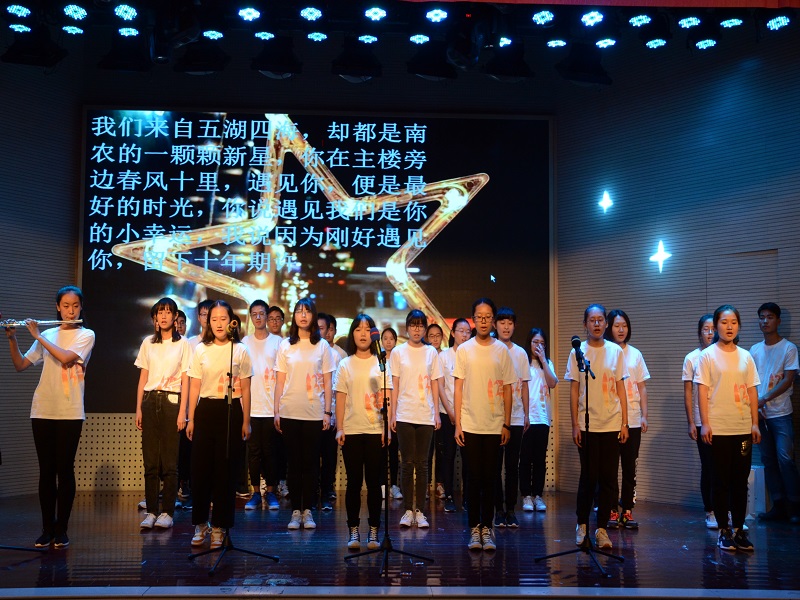 接下来,舞蹈团用曼妙的舞姿将《阿楚姑娘》活灵活现的展现在观众面前。话剧团的《新闻晚知道》用亲身实践同时吃下冬枣和香蕉的方式,向大家展示了什么叫“人生的走马灯”,笑翻全场。器乐团方面,先是一曲由1706班王心怡同学带来的古筝独奏《渔舟唱晚》,接着聂宇和刘屹涵又为大家带来了双吉他指弹《无题》伴随着吉他打板的声音,古风尽显。邰梓洋、聂宇用一首《一次传奇》将整场晚会推向高潮。院十佳歌手张慧欣、倪丹青所演唱的《远走高飞》,空灵中却又带着一丝活泼。1706班的《1706班草争霸》形式多样,从火爆一个夏天的freestyle到国风尽显的武术,从《贵妃醉酒》到跆拳道,应有尽有,令大家大饱眼福,其间插播的“广告”南农烧鸭更是让观众忍俊不禁。而后,话剧团的《面试那点事》,声乐团的《乐动新声》给大家带来了不一样的视听体验。1704班的《南农快讯》以情景剧的形式将其生活的剪影分为三部分向大家展示了课堂趣事、路遇传销、清新的恋爱故事。和所有同学老师一起分享了他们的感动、喜悦……1705班为大家带的《零五三零》先是用一段动感的舞蹈,轰动全场,接着是以“世界上最遥远的距离”为题的一段演讲,在这个属于五班每个人的节目中,他们用自己家乡的方言朗诵出一道诗歌的彩虹,缤纷多彩,无与伦比。最后,伴随着一曲《难忘今宵》将整场晚会推向尾声。