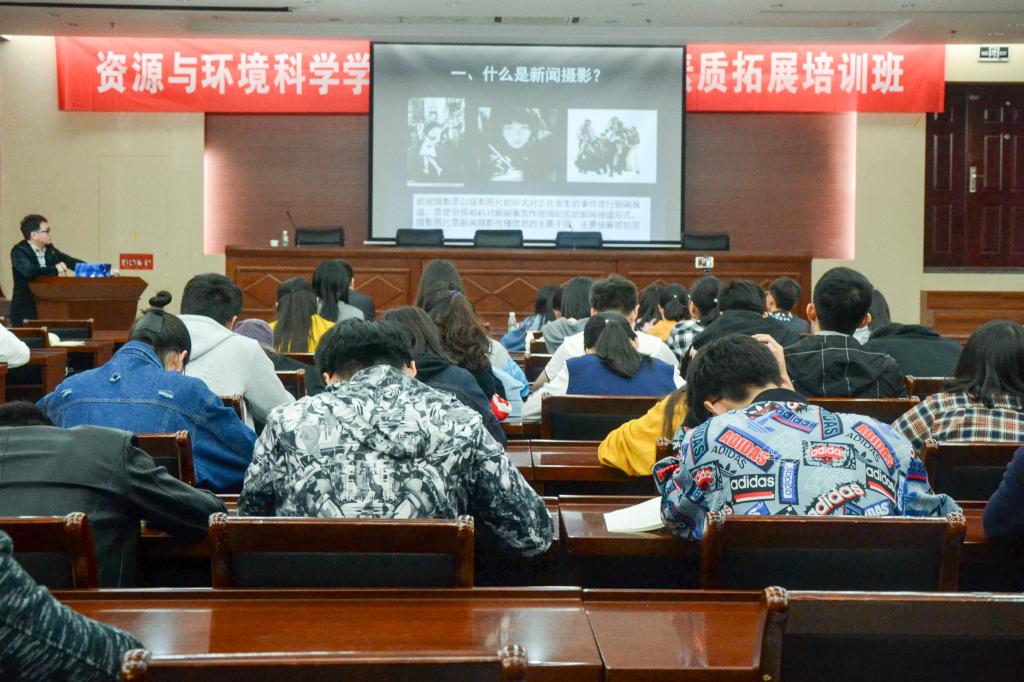 2018年学生干部素质拓展活动开班典礼于资环楼一楼报告厅举行。本次开班典礼邀请了新校区建设办公室李长钦老师和校党委办公室朱珠老师分别作了主题为“新闻摄影、拍摄技巧以及公众号的运营”和“学生干部公文写作与实践”专题讲座。开班典礼由吃瓜网