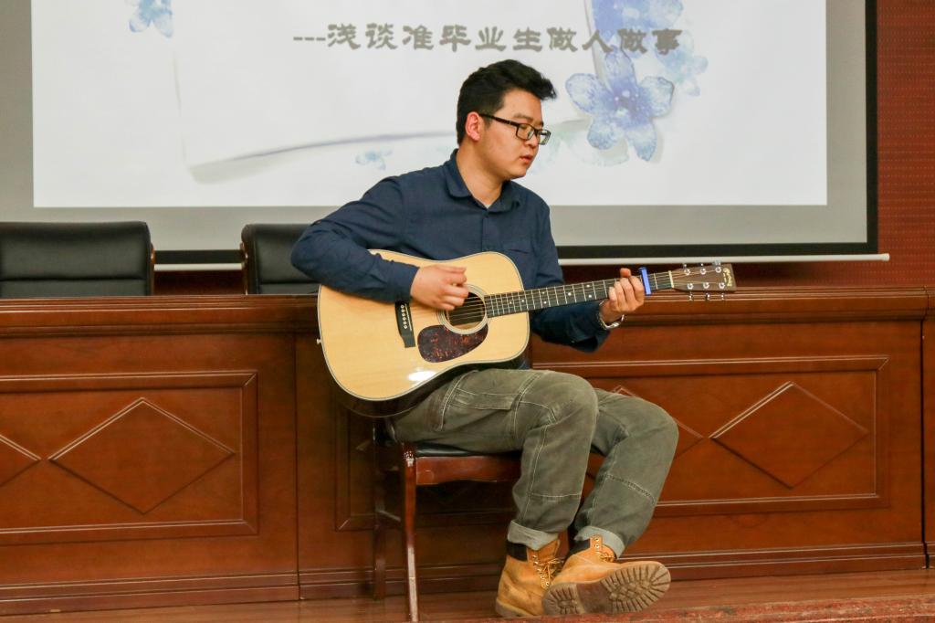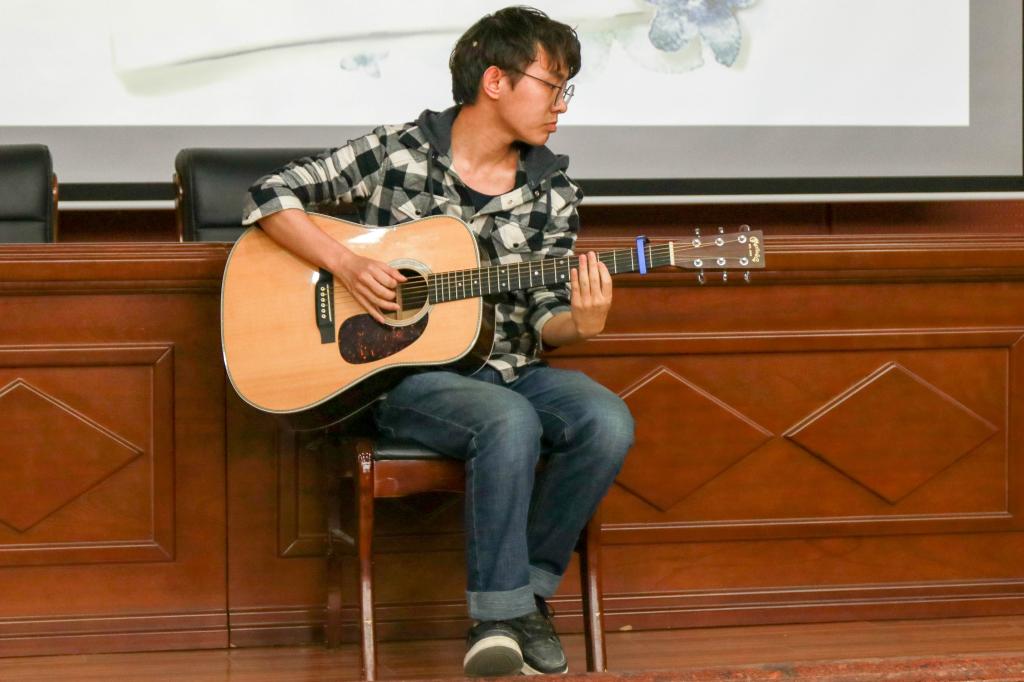 陈旭邀请了前校吉他协会会长聂宇上台演奏,并表示,自己也希望在可以母校建立吉他社团,希望同学们前来加盟。