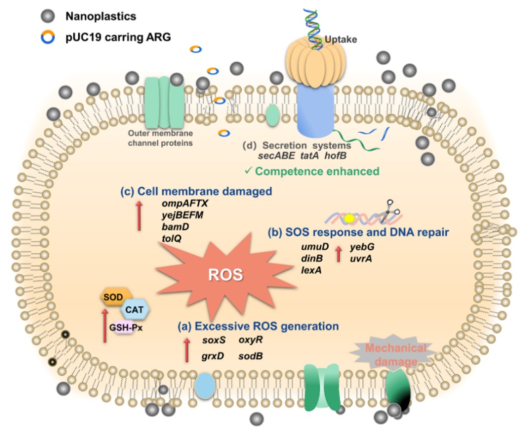 纳米级微塑料促进大肠杆菌细胞转化质粒携带的胞外ARG的机制示意图