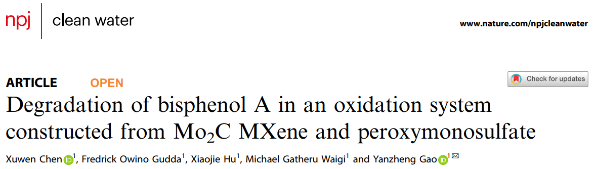 该成果以“Degradation of bisphenol A in an oxidation system constructed from Mo2C MXene and peroxymonosulfate”为题,发表在npj Clean Water上。青年研究员陈旭文为论文第一作者,胡小婕、Fredrick Owino Gudda、Michael Gatheru Waigi参与了研究工作。该研究得到国家自然科学基金组织间合作研究项目等资助。