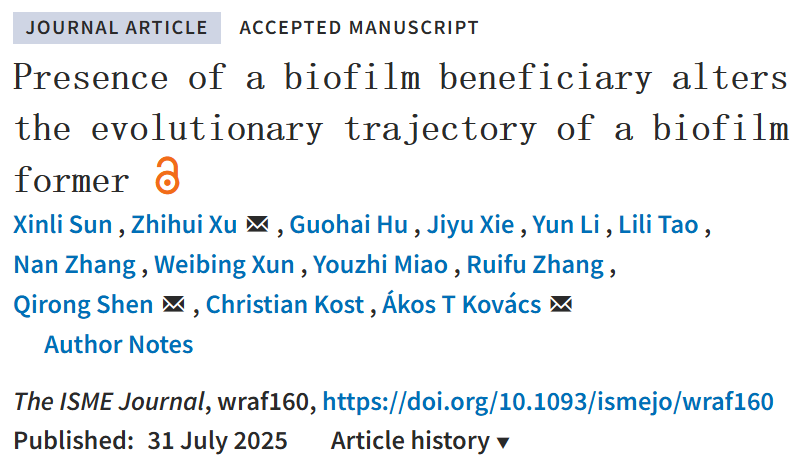 沈其荣院士团队联合荷兰莱顿大学Ákos T. Kovács教授在ISME Journal发表最新研究成果。该研究以贝莱斯芽孢杆菌SQR9(Bacillus velezensis)与与降解斯氏单胞菌XL272(Stutzerimonas degradans,原Pseudomonas stutzeri)构建的双菌生物膜体系为模型,通过18轮实验进化、表型分析、基因组测序和“进化重演”实验,系统揭示了种间互作如何驱动生物膜表型分化及突变演替。
